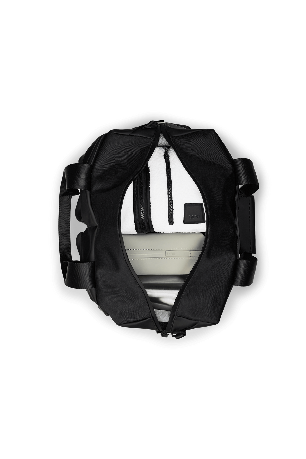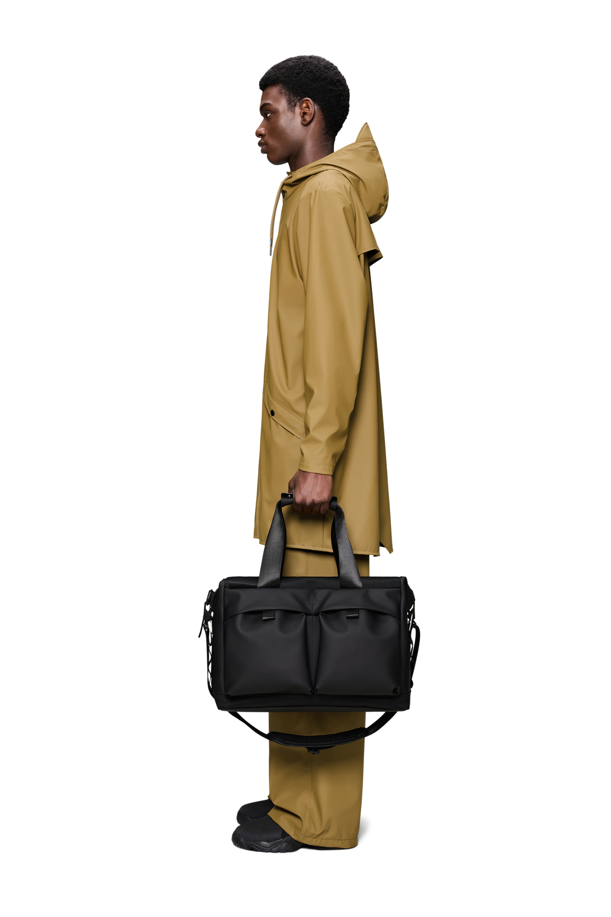 Laget i Rains’ signatur PU-materiale kombinert med slitesterk, vevd polyester. Resultatet? En robust og helt vanntett bag som tåler nordisk vær – året rundt.