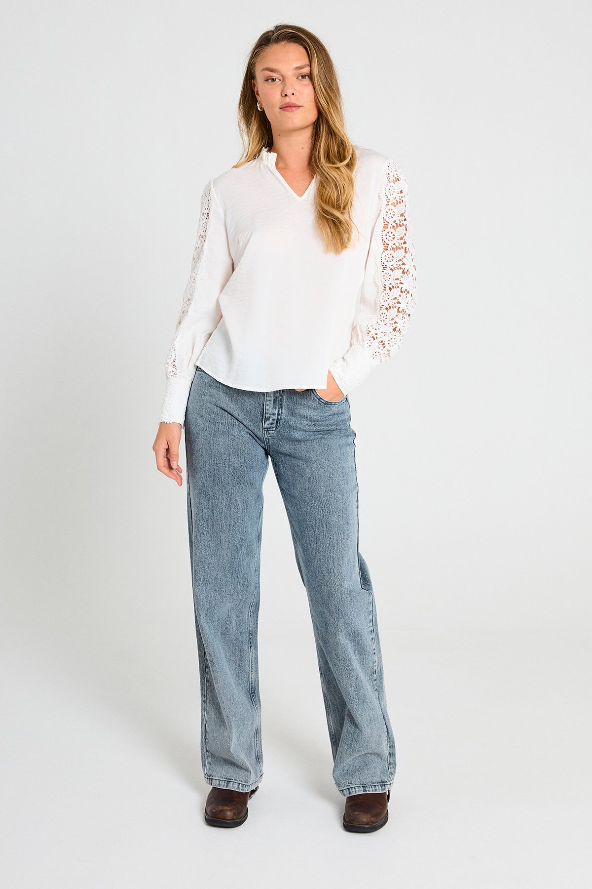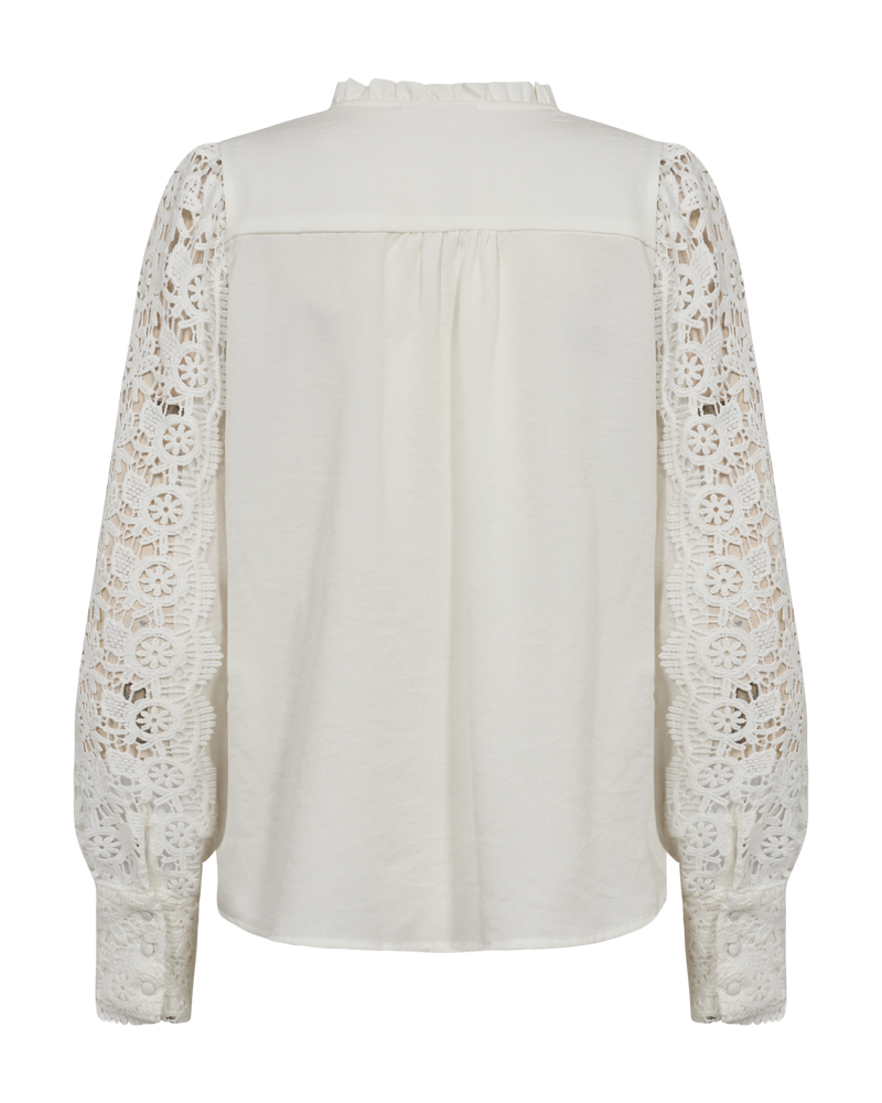FQessa ere n nydelig Off white bluse fra Freequent. Blusen har regular passform med lange armer og v-hals. Blusen har lekker blondedetalj nederst ved mansjettene og nedover ermene. Normal i størrelsen.
