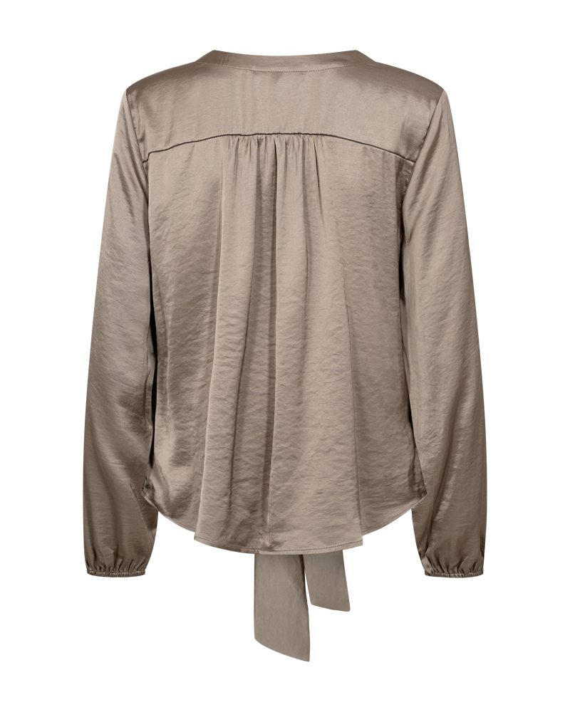 Blusen har v-hals og dekorative knapper foran, og en vakker knytedetalj i livet som gir en feminin og definert silhuett. De lange ermene har elastikk nederst for en lett puff-effekt, og små legg bak på ryggen gir det lille ekstra.