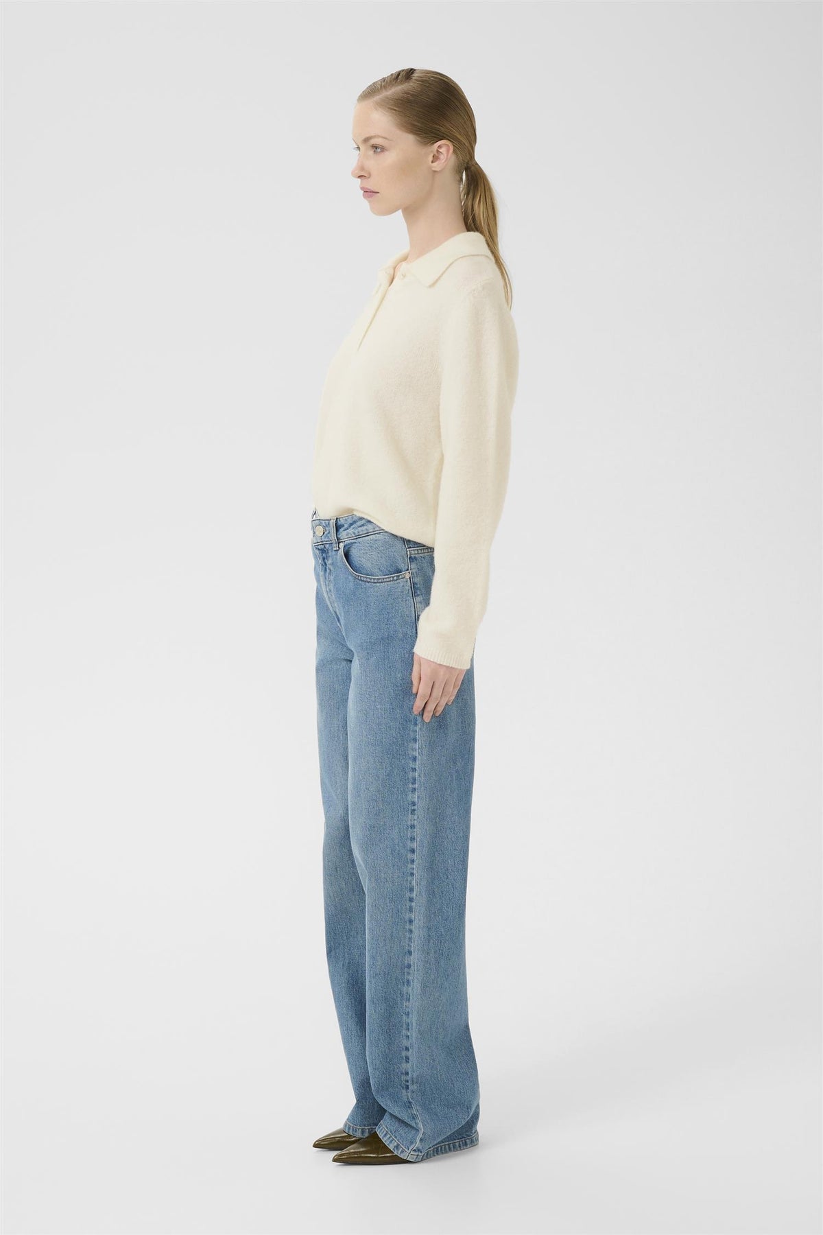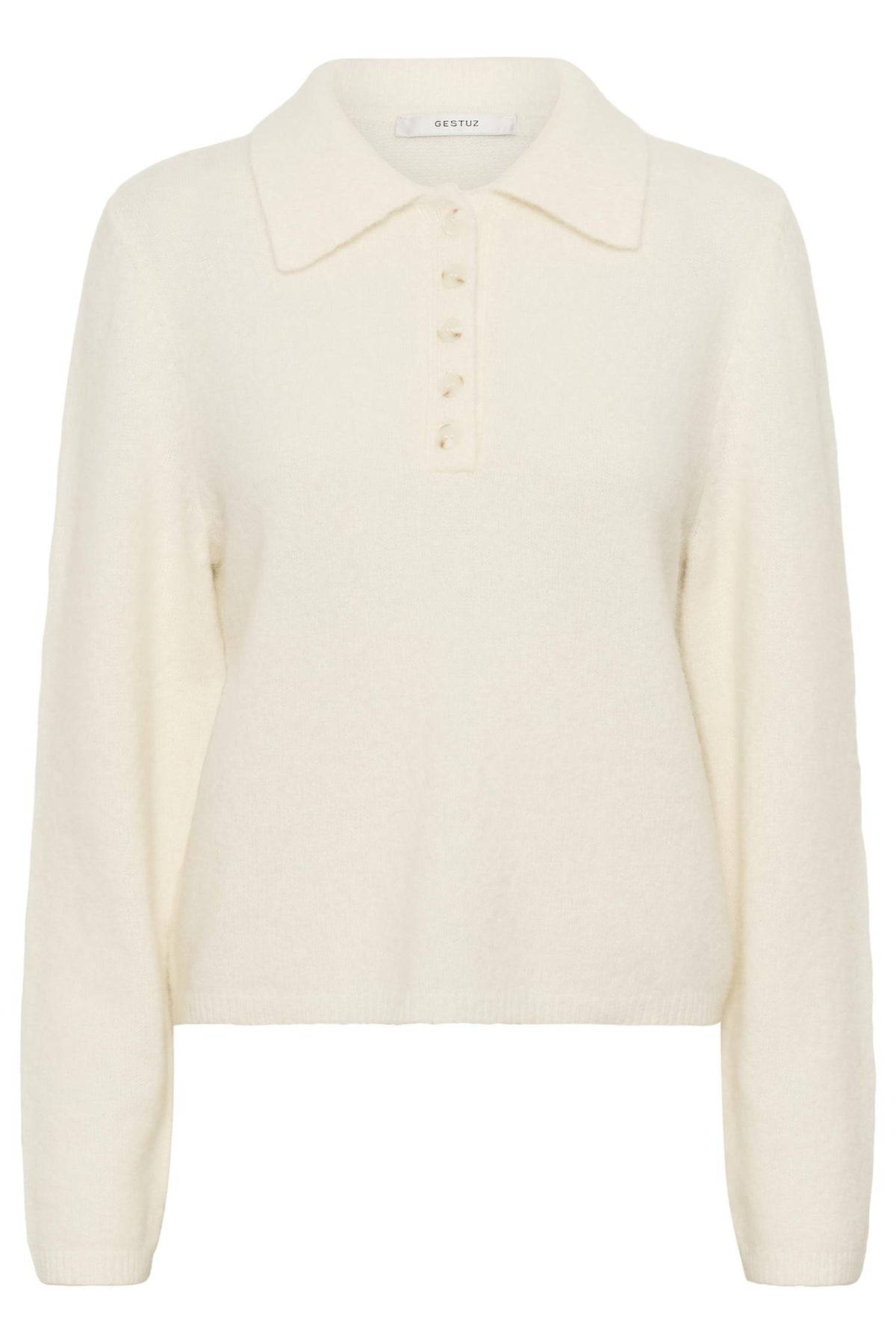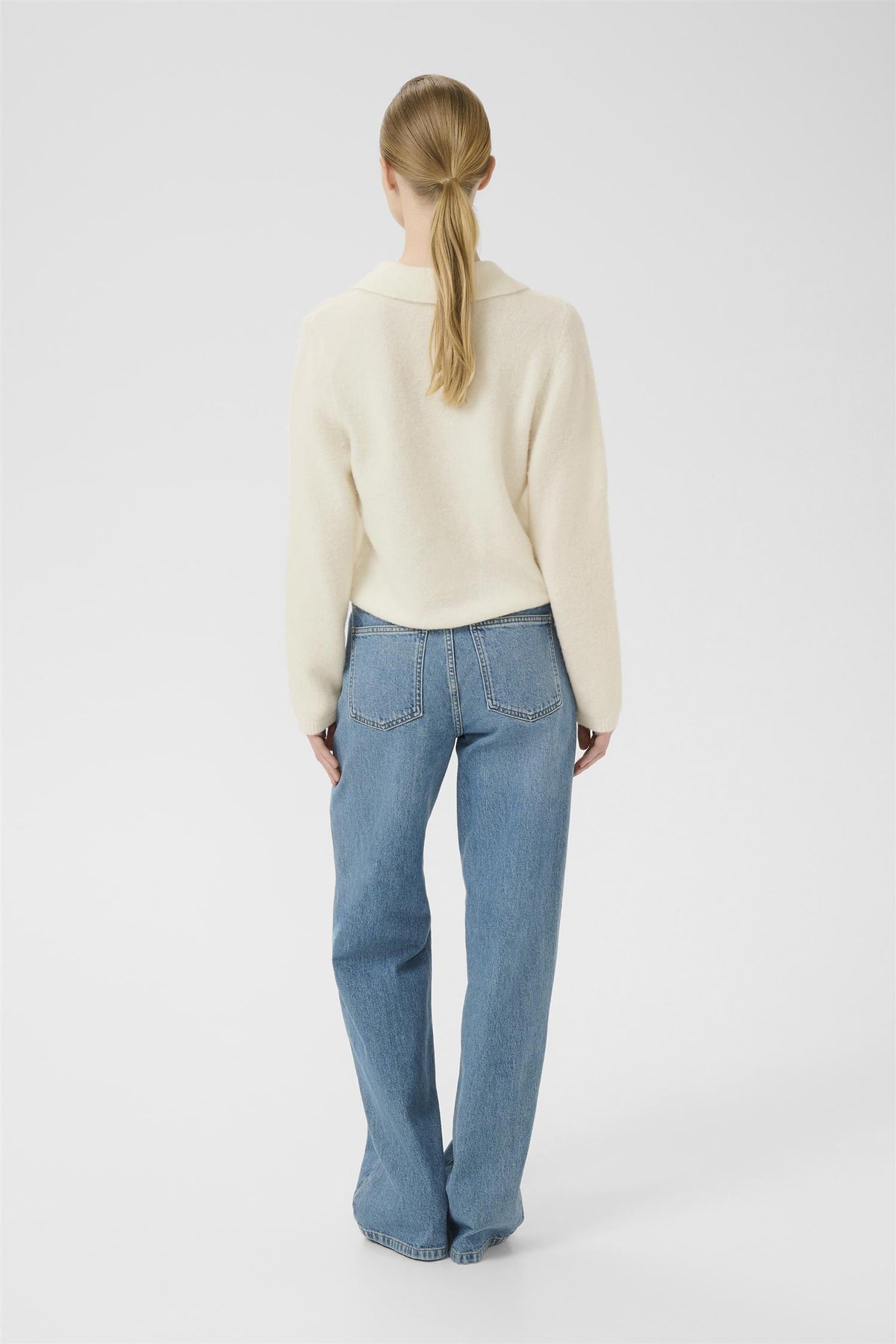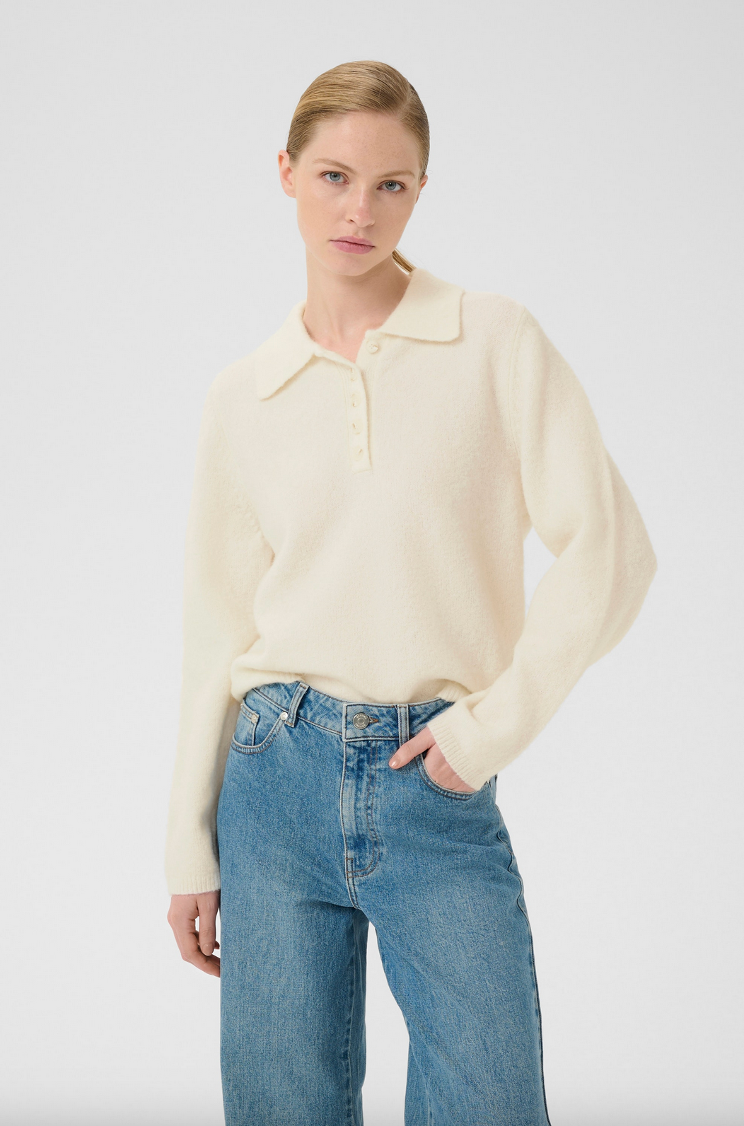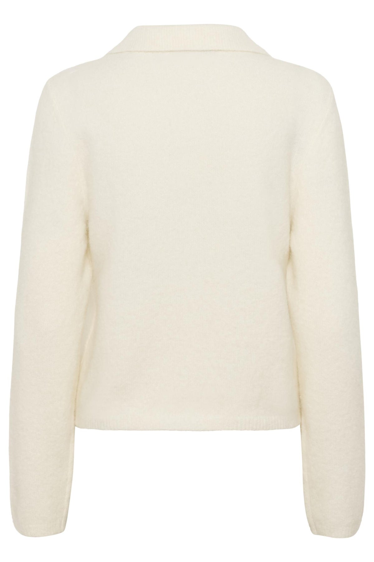 Myk strikkegenser med avslappet passform, klassisk polokrage og hel knappestolpe. Designet med lange ermer og ribbestrikkede kanter for komfort og struktur. Modellen er 175 cm høy og har på seg størrelse S/36.