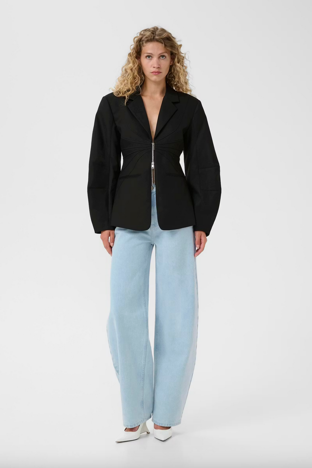 Den rene glidelåsløsningen i front gir blazeren et moderne preg og gjør den enkel å style – enten lukket som et statement-plagg, eller åpen over en topp eller kjole. Markerte ermer tilfører struktur og gir et gjennomført, eksklusivt uttrykk.