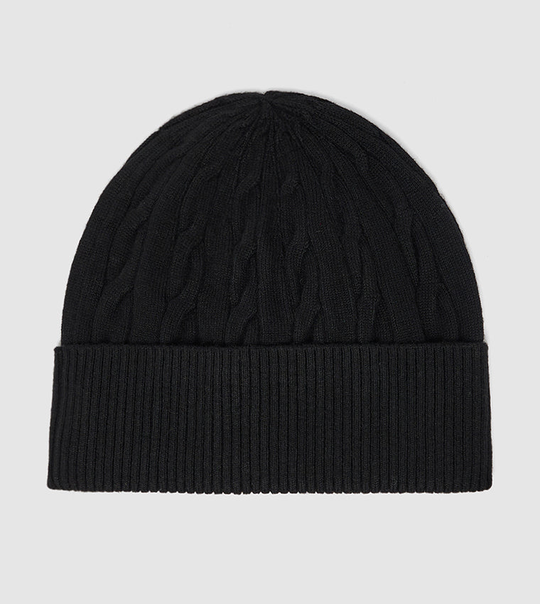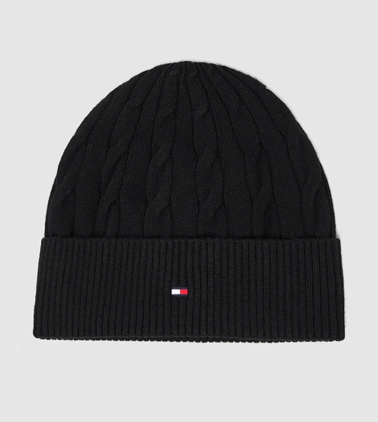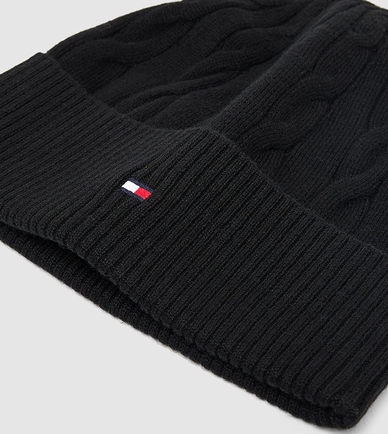 tommy hilfiger lue herre, sort beanie, unisex lue, kabelstrikket lue, th flag cable knit beanie, sort vinterlue, klassisk lue fra Tommy Hilfiger