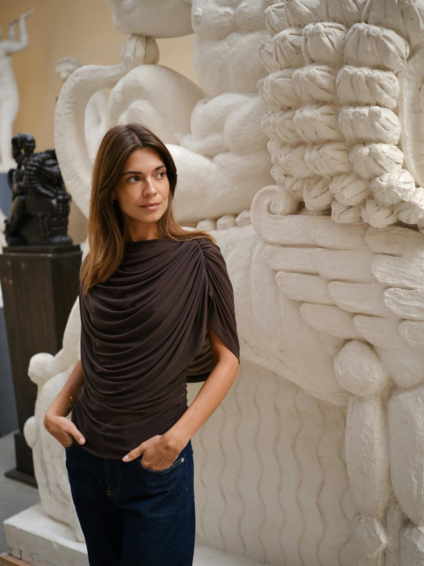 Style Cottuna Drapy Mesh Top med dressbukse eller skjørt og hæler for en elegant festlook, eller bruk den med jeans og boots for et mer avslappet, men sofistikert hverdagsantrekk. Perfekt også under blazer.