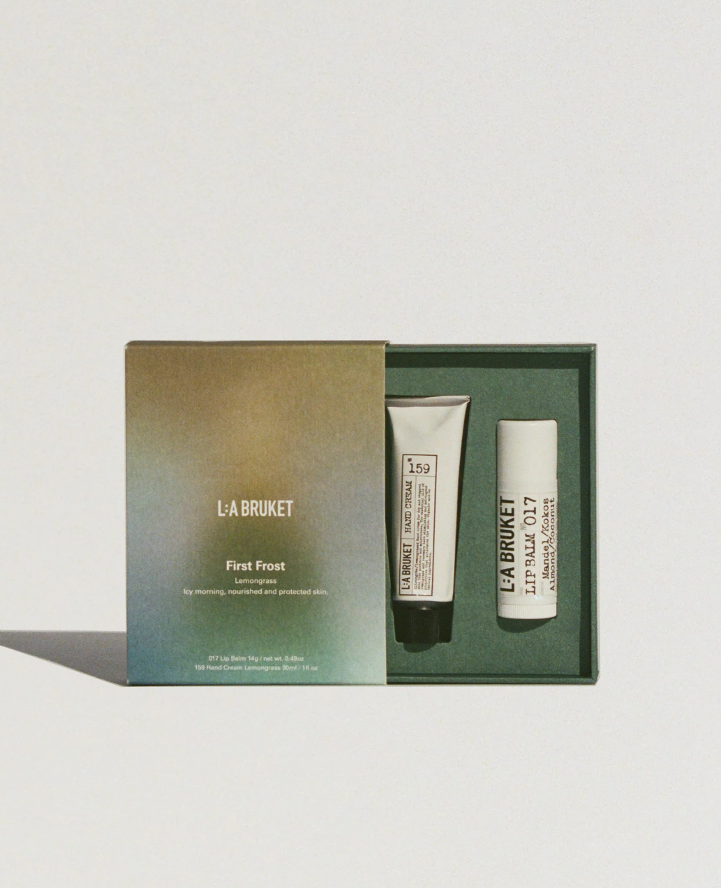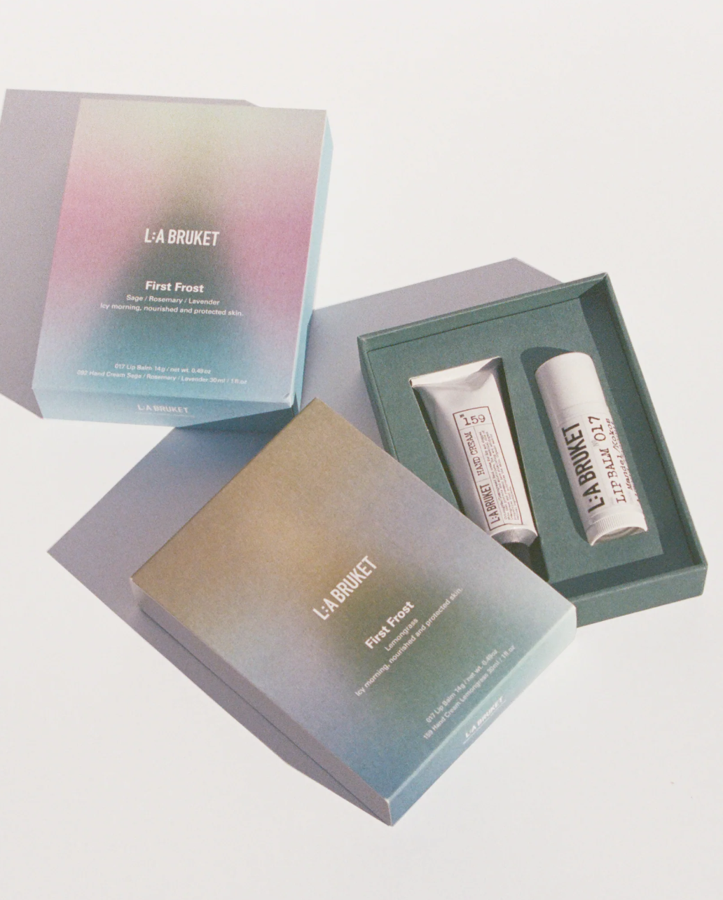 Gi bort et øyeblikk av velvære med First Frost Gift Set – et luksuriøst gavesett fra A: Bruket som inneholder to ikoniske bestselgere: den prisbelønte leppebalmen og den COSMOS-sertifiserte håndkremen. Dette er den perfekte gaven til vinterhud som trenger fukt, næring og beskyttelse – pakket inn i nordisk ro og kvalitet.