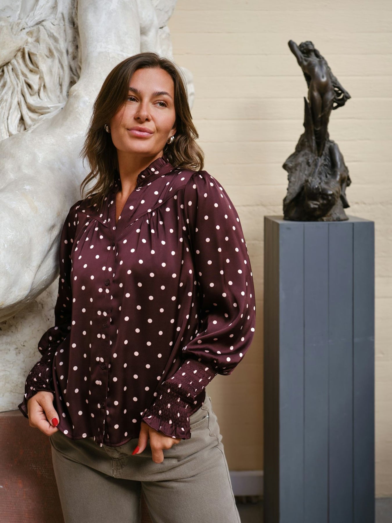 Camisa Dot Blouse fra Neo Noir er en lekker satengbluse med et lett løstsittende snitt og et fint fall som gir et elegant og feminint uttrykk. Blusen er mørk burgunder med delikate lyserosa prikker over hele plagget, og har elastiske mansjetter ved ermene som gir en raffinert detalj.