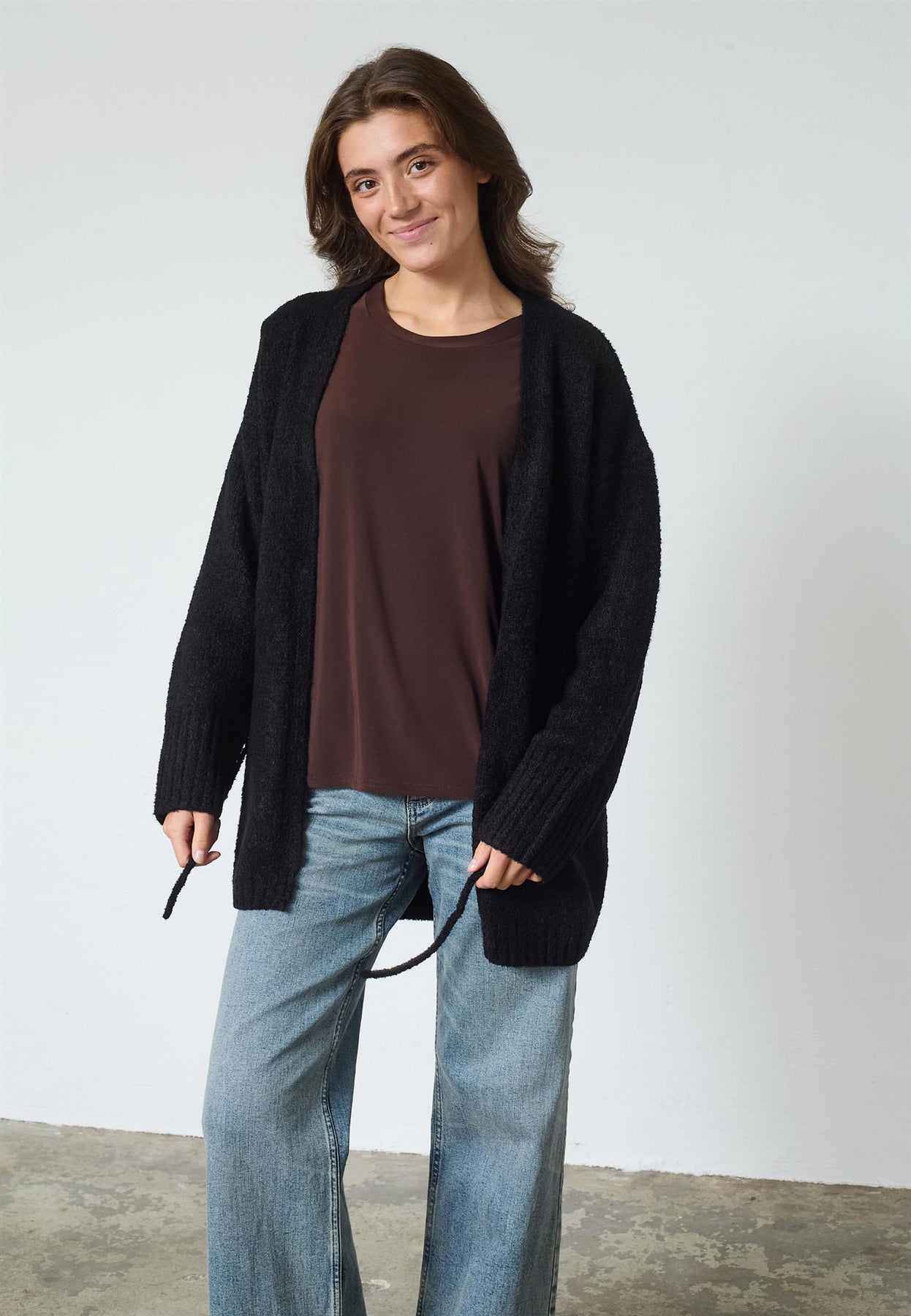 HEMMA-CA fra Sisters Point (18696) er den perfekte myke og stilrene cardiganen for kjølige dager. Den har langermet, løst design med V-hals og åpen front som lukkes elegant med et knytebånd i midjen. Ribbestrikkede kanter ved ermer og nederkant gir et rent og feminint uttrykk, mens det lette strikkematerialet sikrer høy komfort hele dagen.