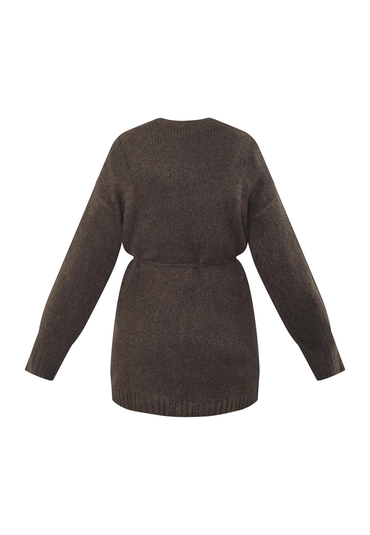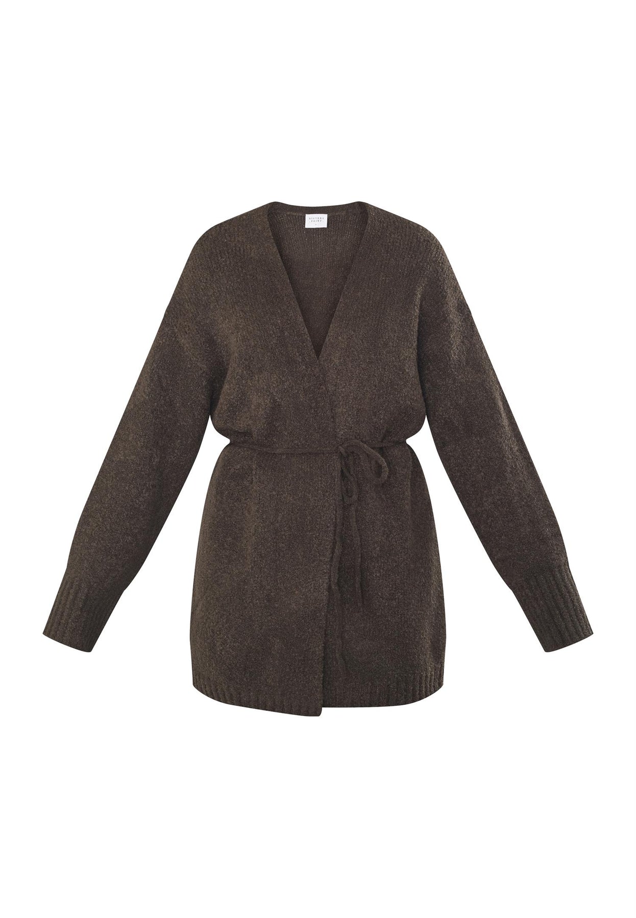 Brun strikkecardigan med V-hals og knytebånd i livet. Perfekt til både jobb og hverdag. HEMMA-CA fra Sisters Point!