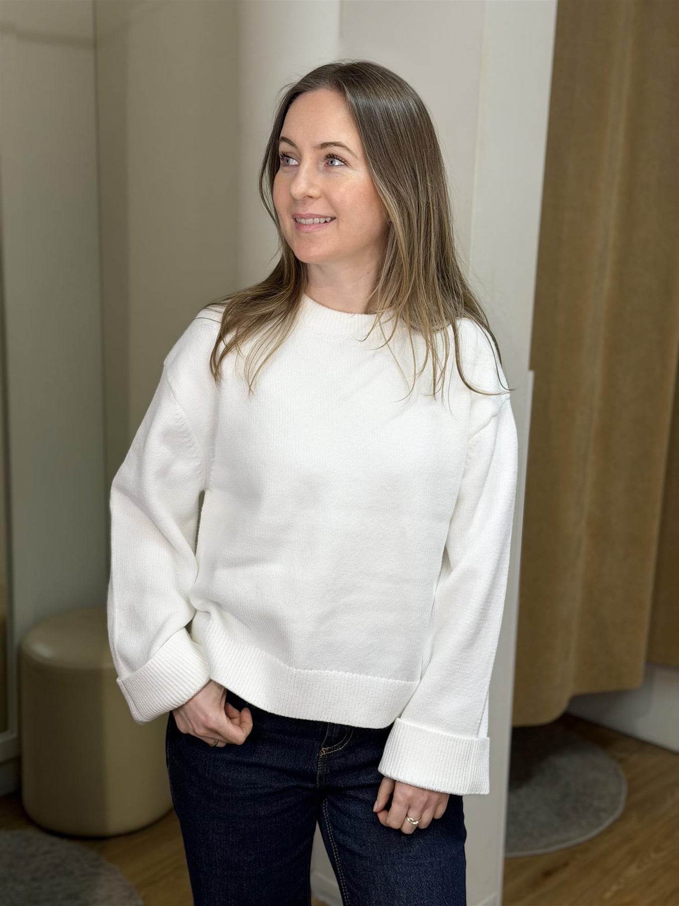 Den hvite fargen gir genseren et rent, lyst og tidløst uttrykk som er enkelt å style til alt. Perfekt til kjølige sommerkvelder, lyse vårdager eller som en behagelig genser året rundt. Den runde halsen og det enkle designet gjør den til en naturlig favoritt i hverdagen.