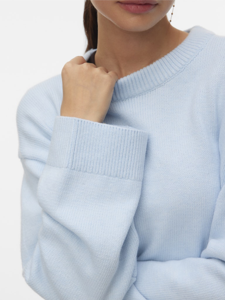 Den lyseblå fargen gir genseren et friskt og lett uttrykk, perfekt både til kjølige sommerkvelder og som helårsstrikk. Den runde halsen og det enkle designet gjør den svært anvendelig – style den med boyfriend-jeans for en casual look, eller bruk den over en kjole for et mer feminint og avslappet antrekk.