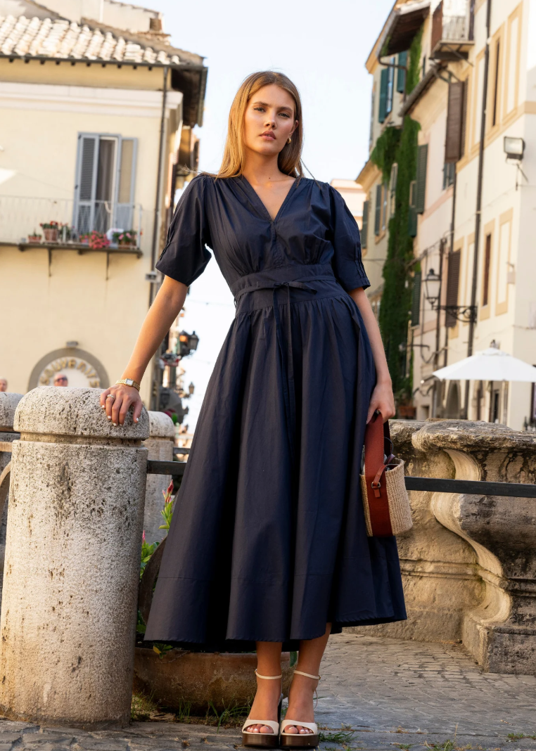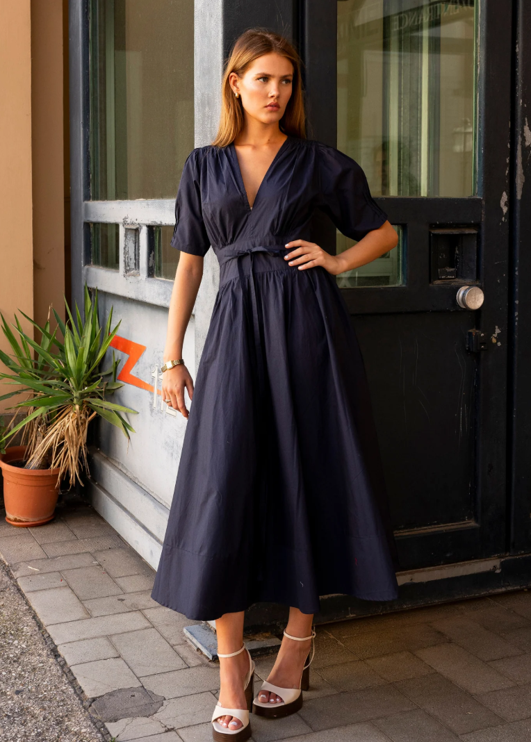 Miss Maya Maria dress poplin i marine En feminin og tidløs kjole i crisp bomullspoplin fra Miss Maya. Maria har delikate puffermer, flatterende V-utringning og et skjørt som gir en elegant silhuett. Perfekt til både hverdag og sommerens anledninger.