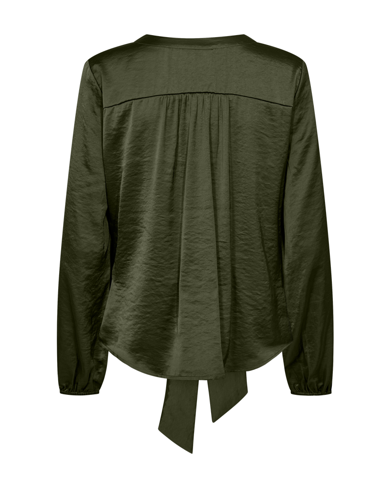 Blusen har v-hals og dekorative knapper foran, og en vakker knytedetalj i livet som gir en feminin og definert silhuett. De lange ermene har elastikk nederst for en lett puff-effekt, og små legg bak på ryggen gir det lille ekstra.