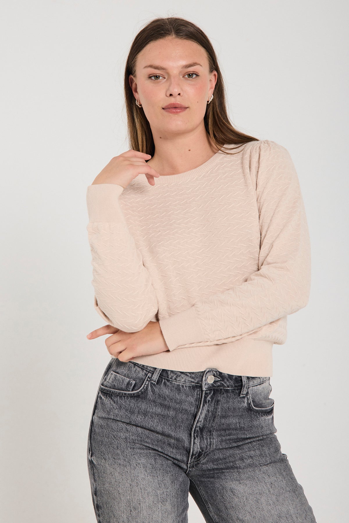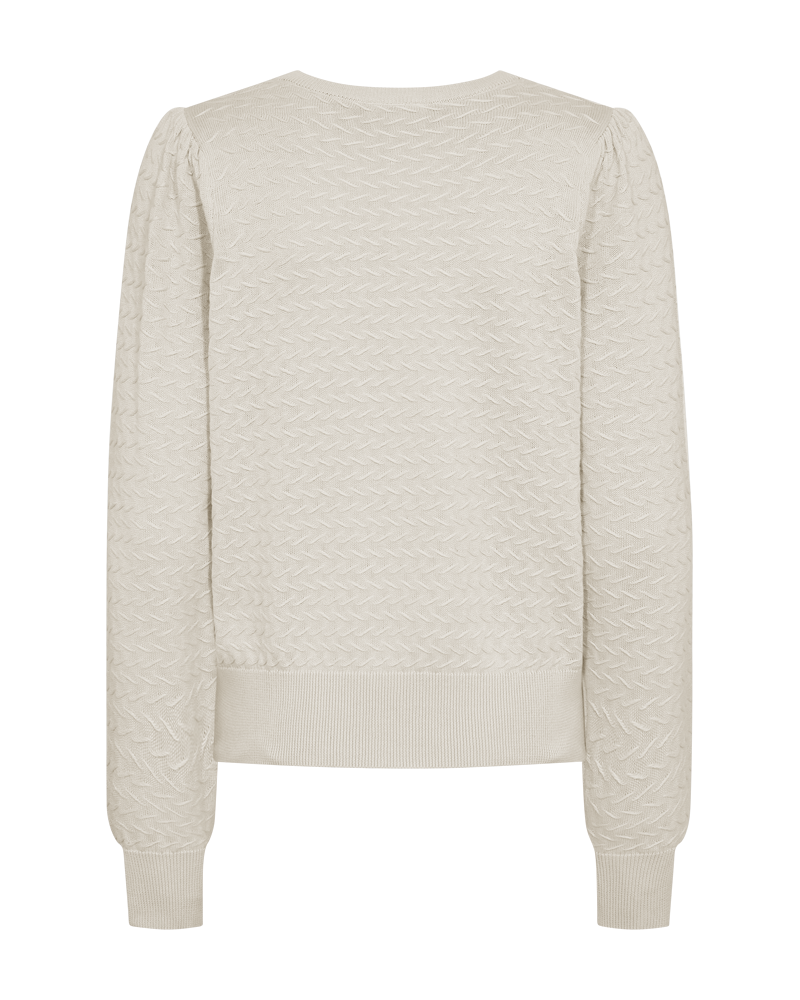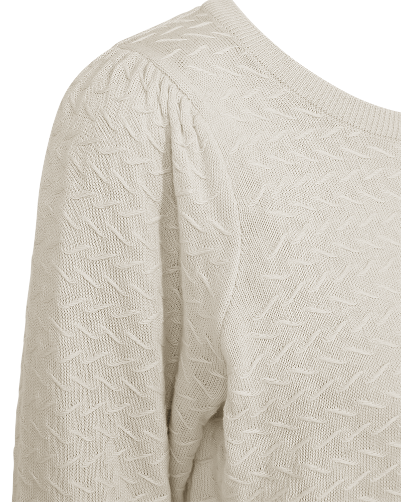 FQdodo Pullover fra Freequent er en tidløs og anvendelig strikkegenser i en nydelig, lys beige nyanse (Moonbeam). Laget i 100 % bomull, har den en tykk og klassisk bomullsstrikk som gir både komfort og struktur. Med rund hals, lange ermer og en diskré puff ved skuldrene, kombinerer den det klassiske med et hint av femininitet.