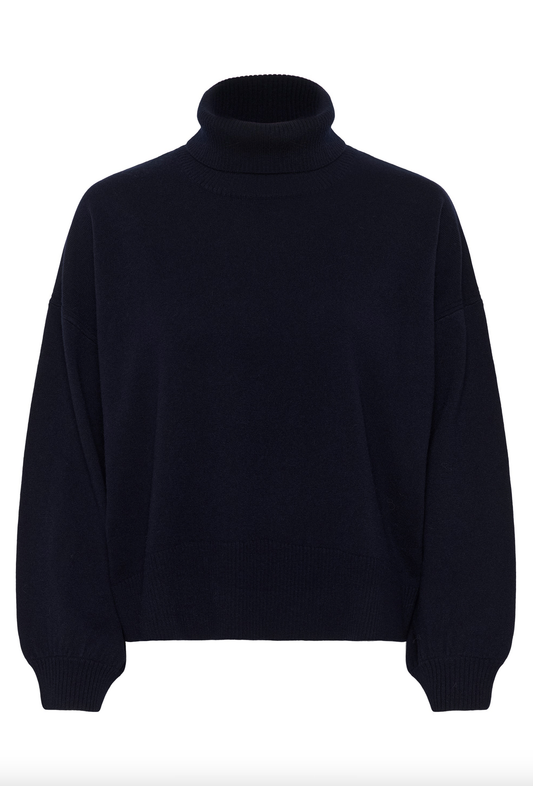 GZmanzi Pullover fra Gestuz i marineblå. Myk ullgenser med loose fit, lange ermer og hips-lengde. Perfekt som tidløs og komfortabel basisgenser til hverdags og fest.