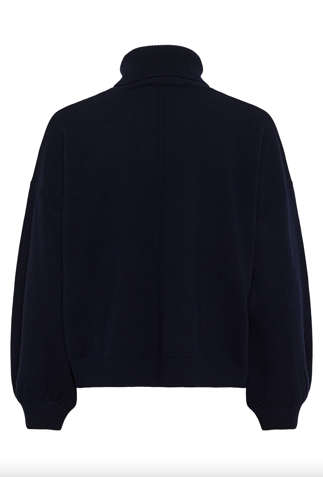 Denne marineblå ullgenseren blir raskt en basisfavoritt i garderoben, takket være sin allsidighet, kvalitet og komfort.