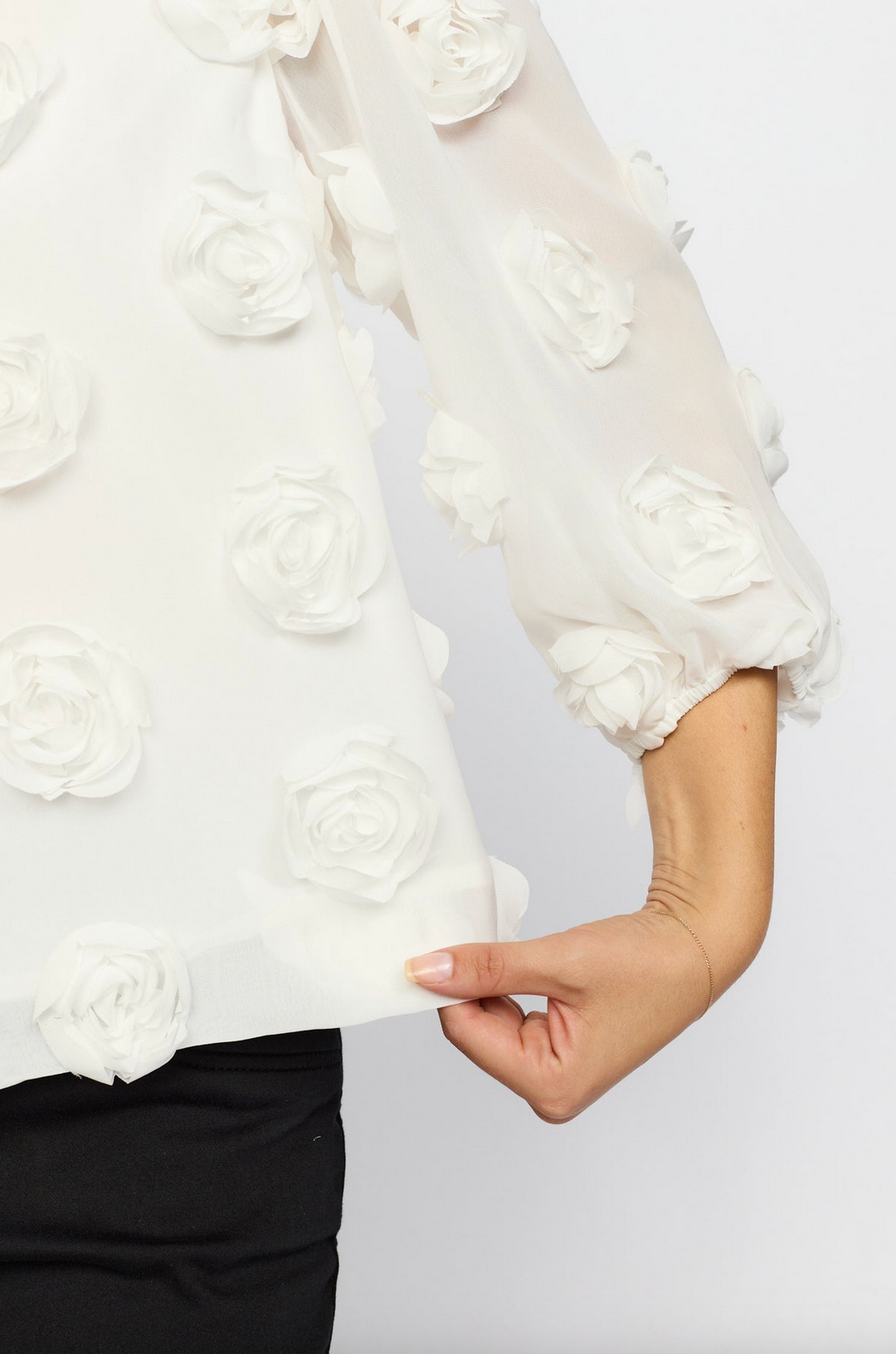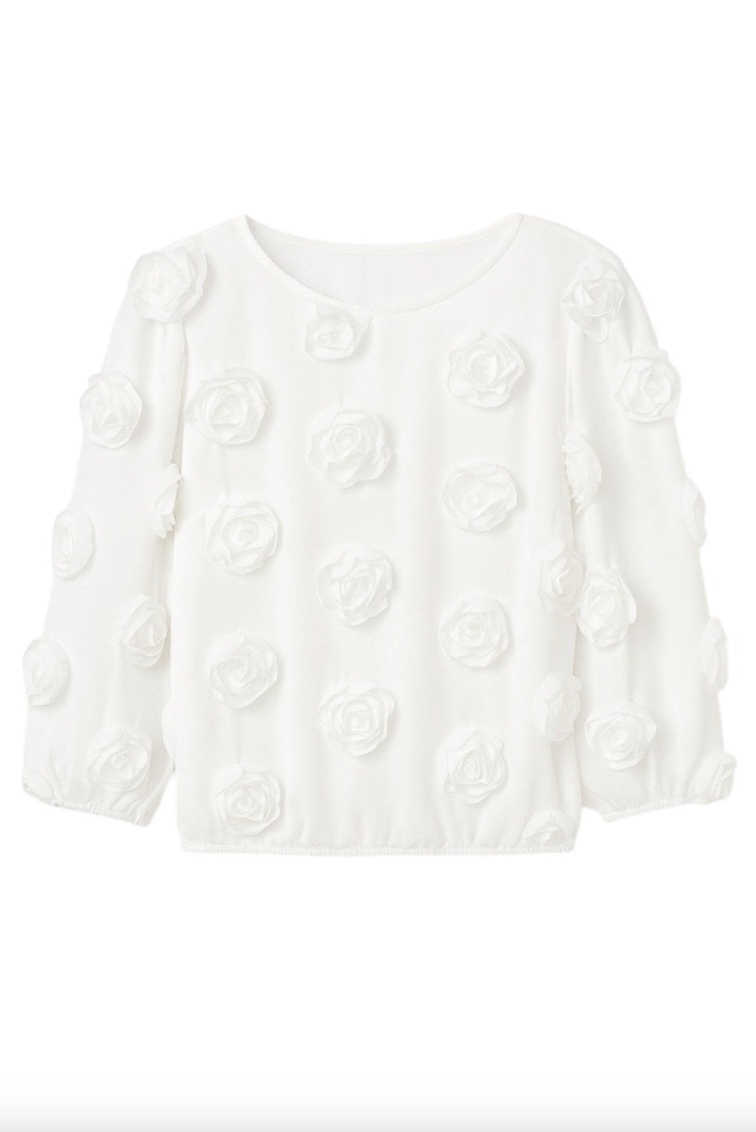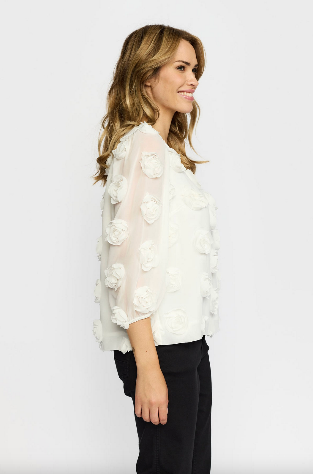 Lekker offwhite Bluse i struktureret stoff med tredimensjonelle rosedetaljer og korte ballonermer. Rett og lett løstsittende passform. Normal i størrelsen.