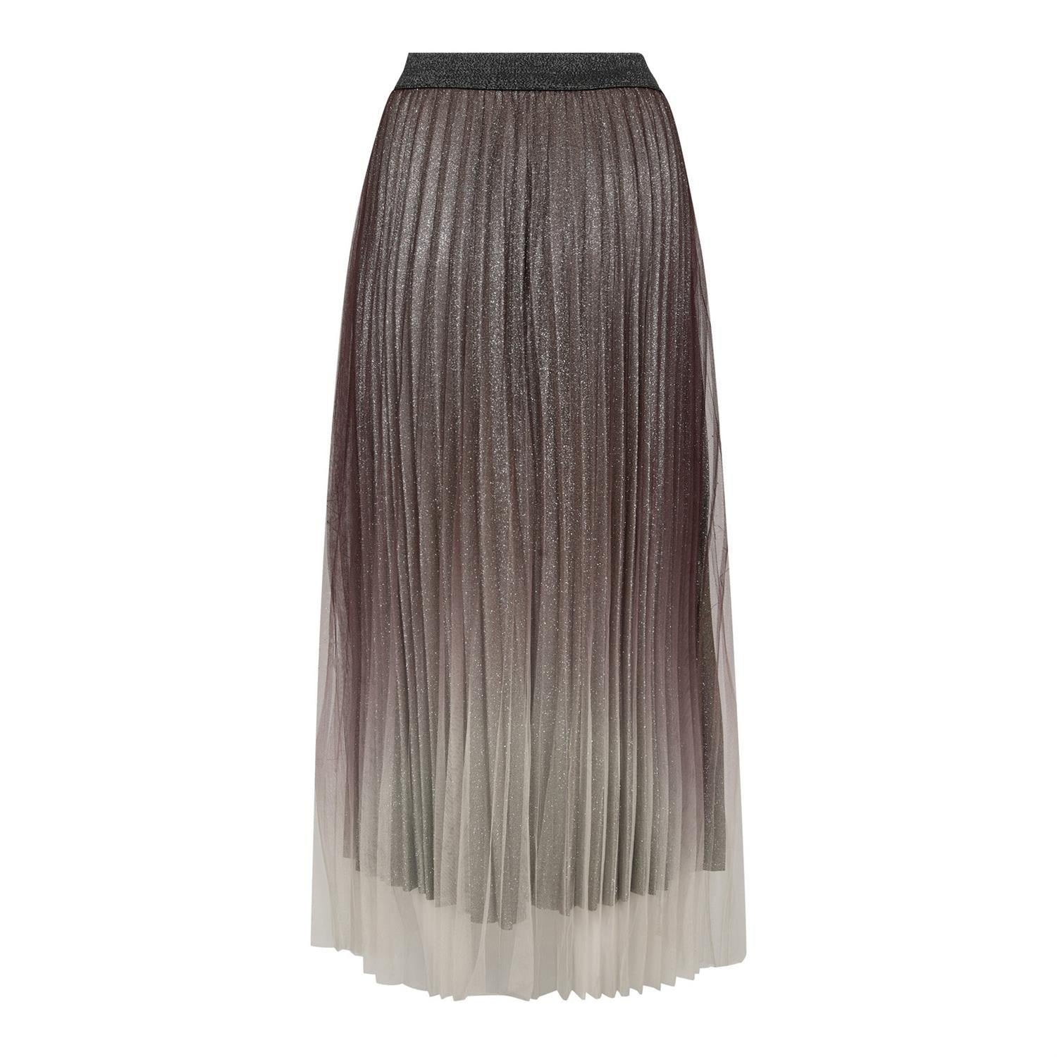 Nydelig klassisk skjørt med plisse i en nydelig fargekombinasjon. Kombinasjonen med det brune og det lekre underskjørtet med sølvtoner, kan ta pusten fra en ! Skjørtet er like fint til hverdags med en lekker strikk til, som til den fineste festen med høye heler og en lekker topp til. Skjørtet har elastikk linning og oppleves som normalt i størrelsen.