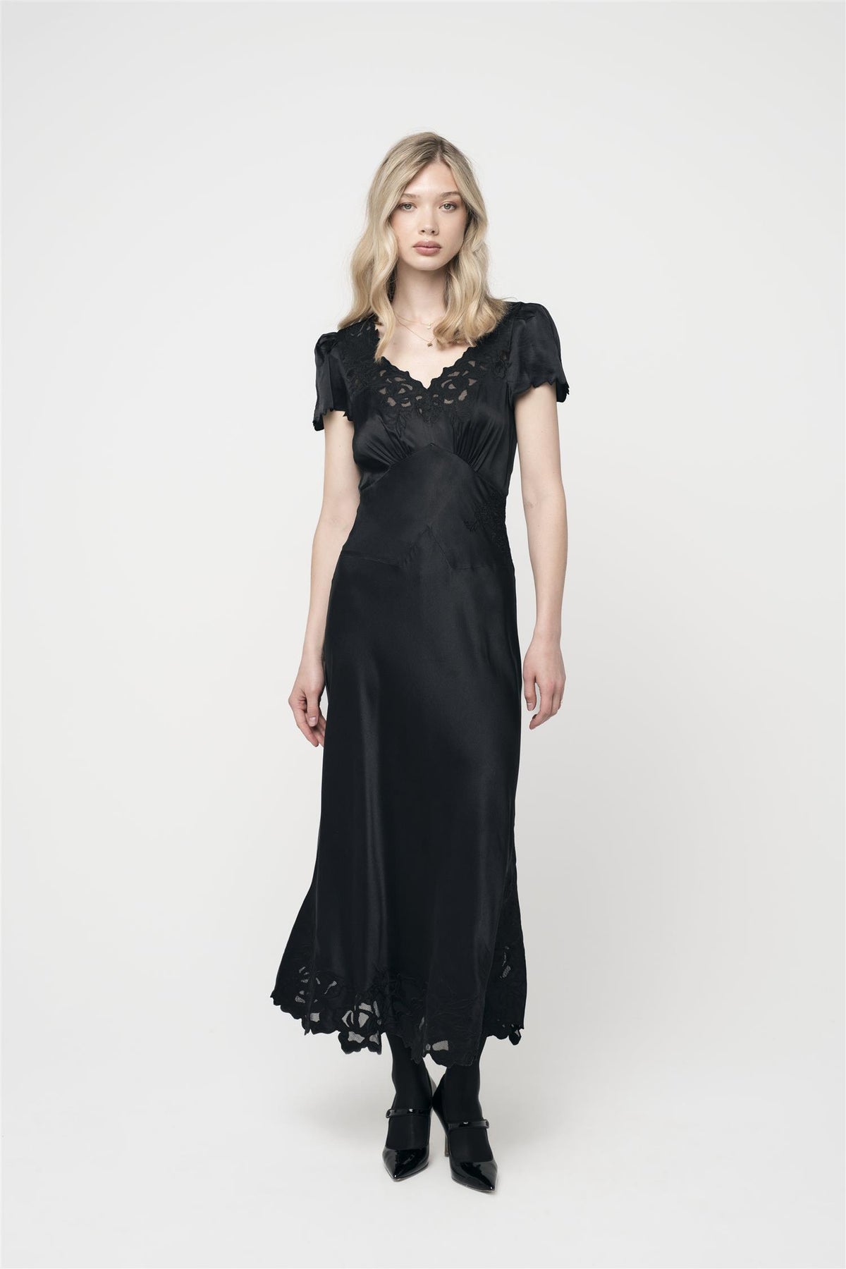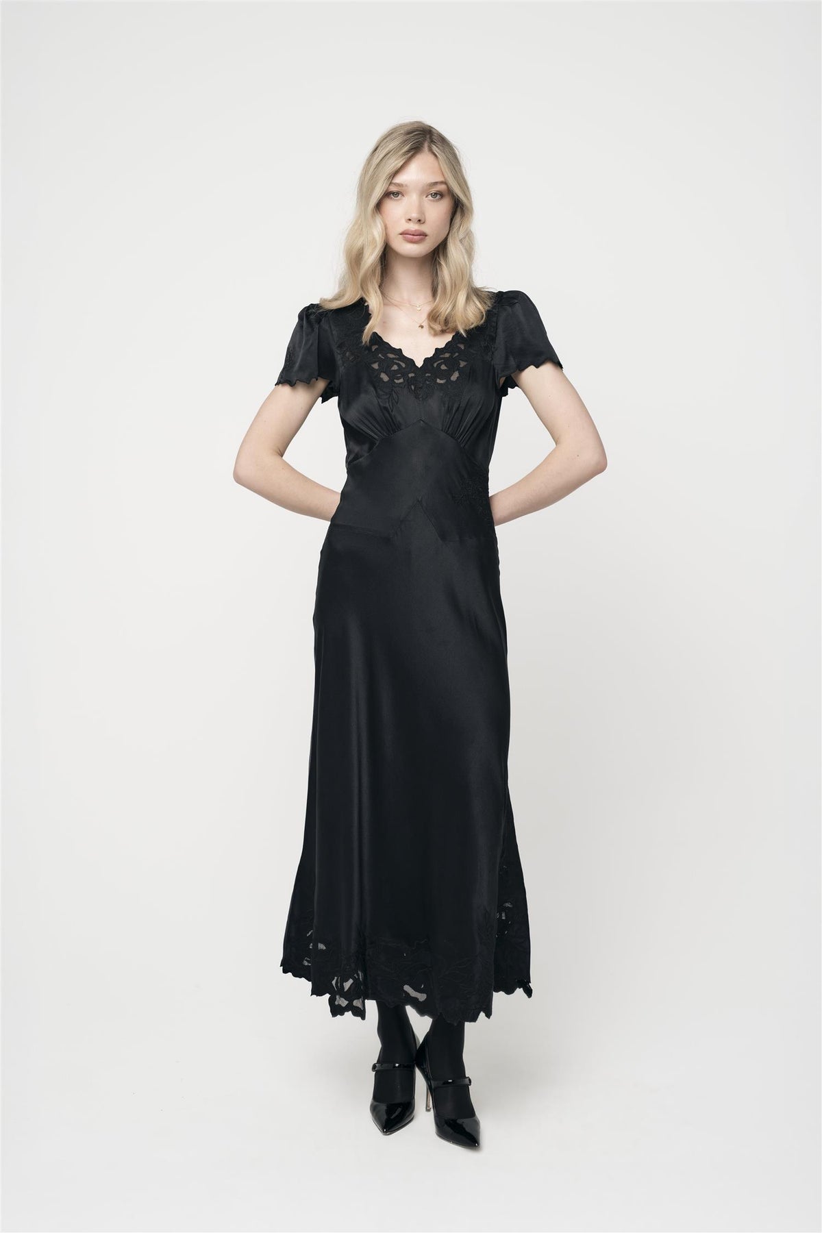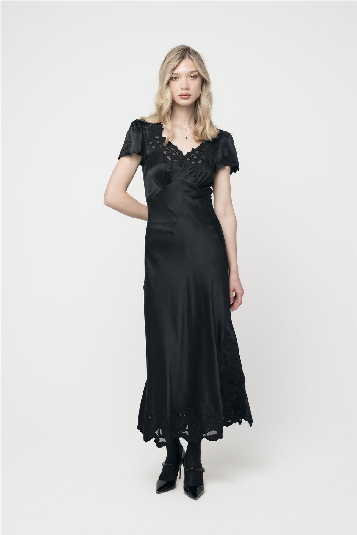 Marley Rose fra Pia Tjelta er en lang, sort kjole med delikate blondedetaljer og en flatterende silhuett. Kjolen er laget i en eksklusiv silkekvalitet med stretch, noe som gir både eleganse og bevegelsesfrihet. En romantisk, men dempet kjole som passer til alle anledninger – fra bryllup og selskaper til julebord og fine middager.
