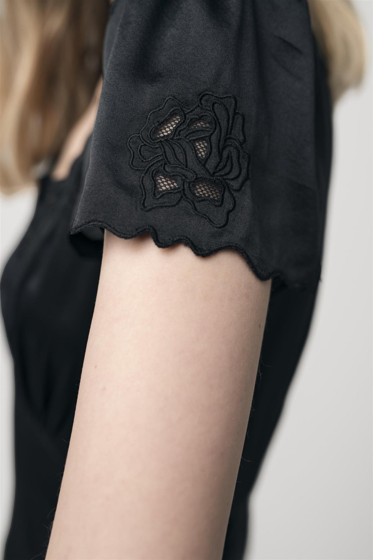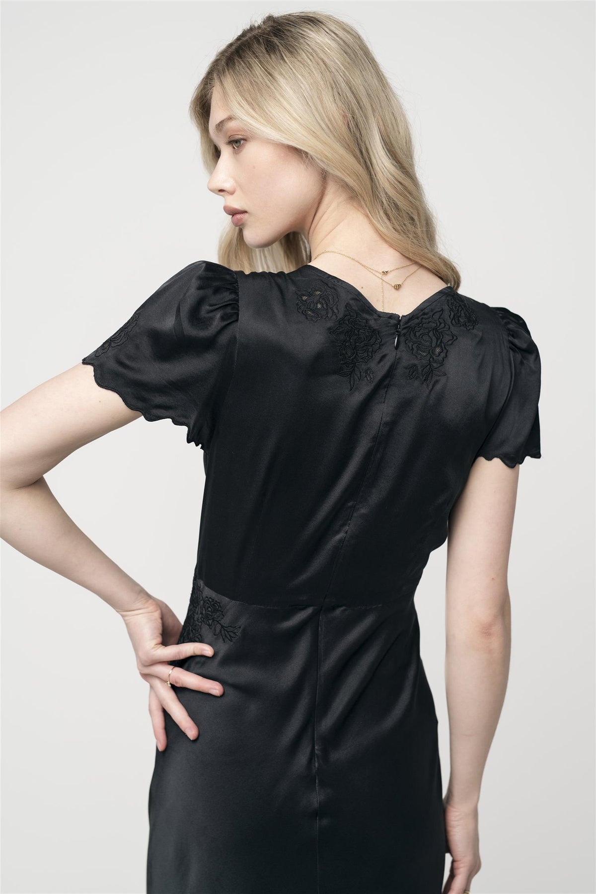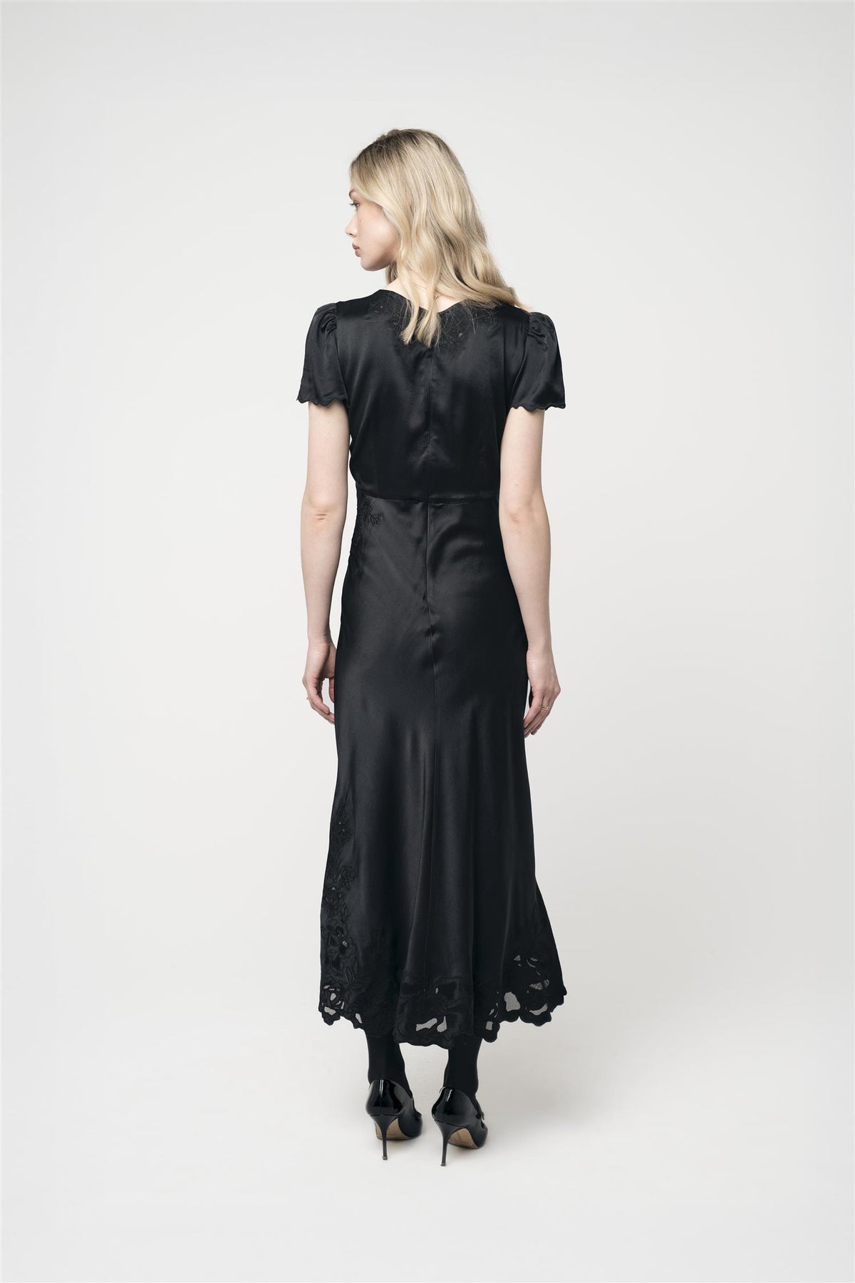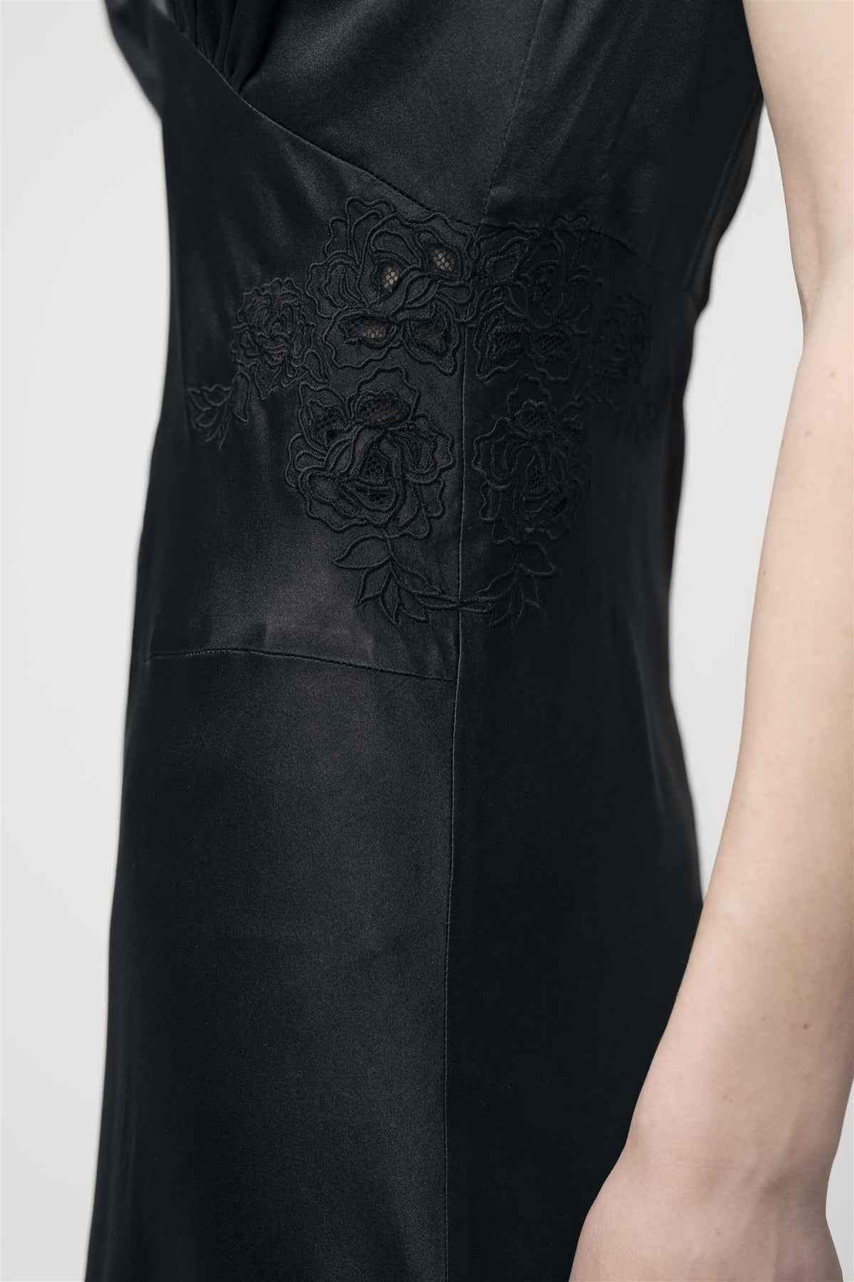 Marley Rose fra Pia Tjelta er en lang, sort kjole med delikate blondedetaljer og en flatterende silhuett. Kjolen er laget i en eksklusiv silkekvalitet med stretch, noe som gir både eleganse og bevegelsesfrihet. En romantisk, men dempet kjole som passer til alle anledninger – fra bryllup og selskaper til julebord og fine middager.