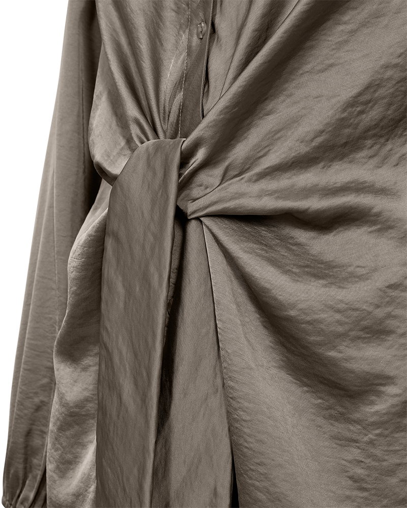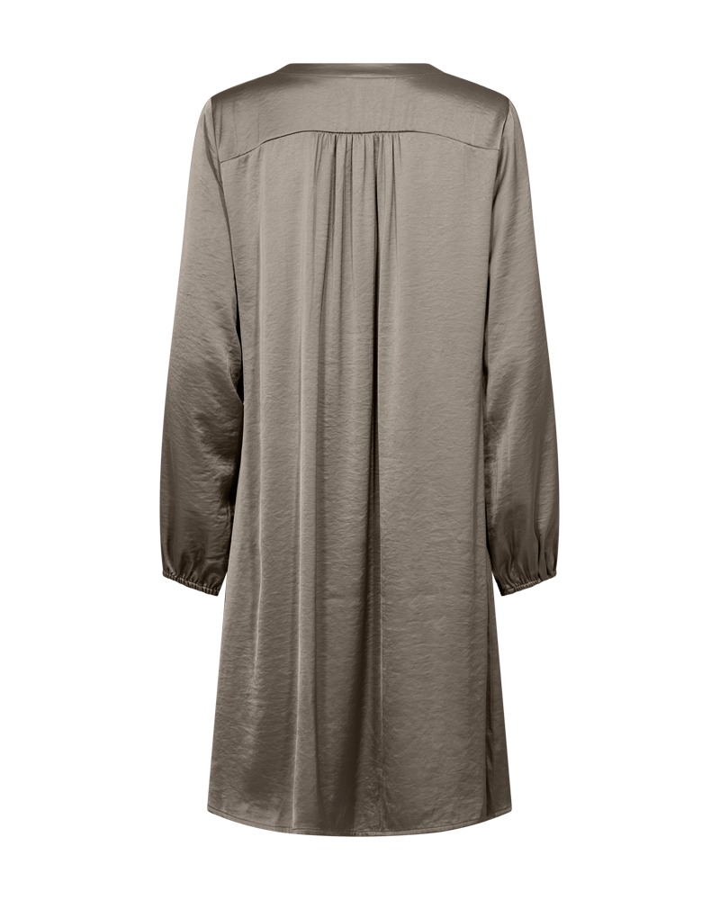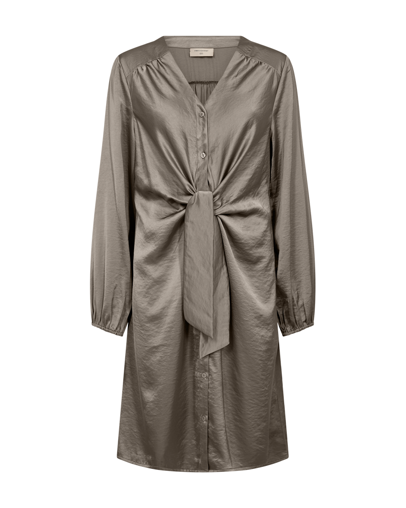 Kjolen har en v-hals med knappestolpe foran, en vakker knytedetalj i livet og lange ermer med elastikk nederst for et sofistikert uttrykk. De små leggene bak gir ekstra bevegelse og en nydelig fall i stoffet. Lengden går til ca. knærne – perfekt for både hverdag og fest.