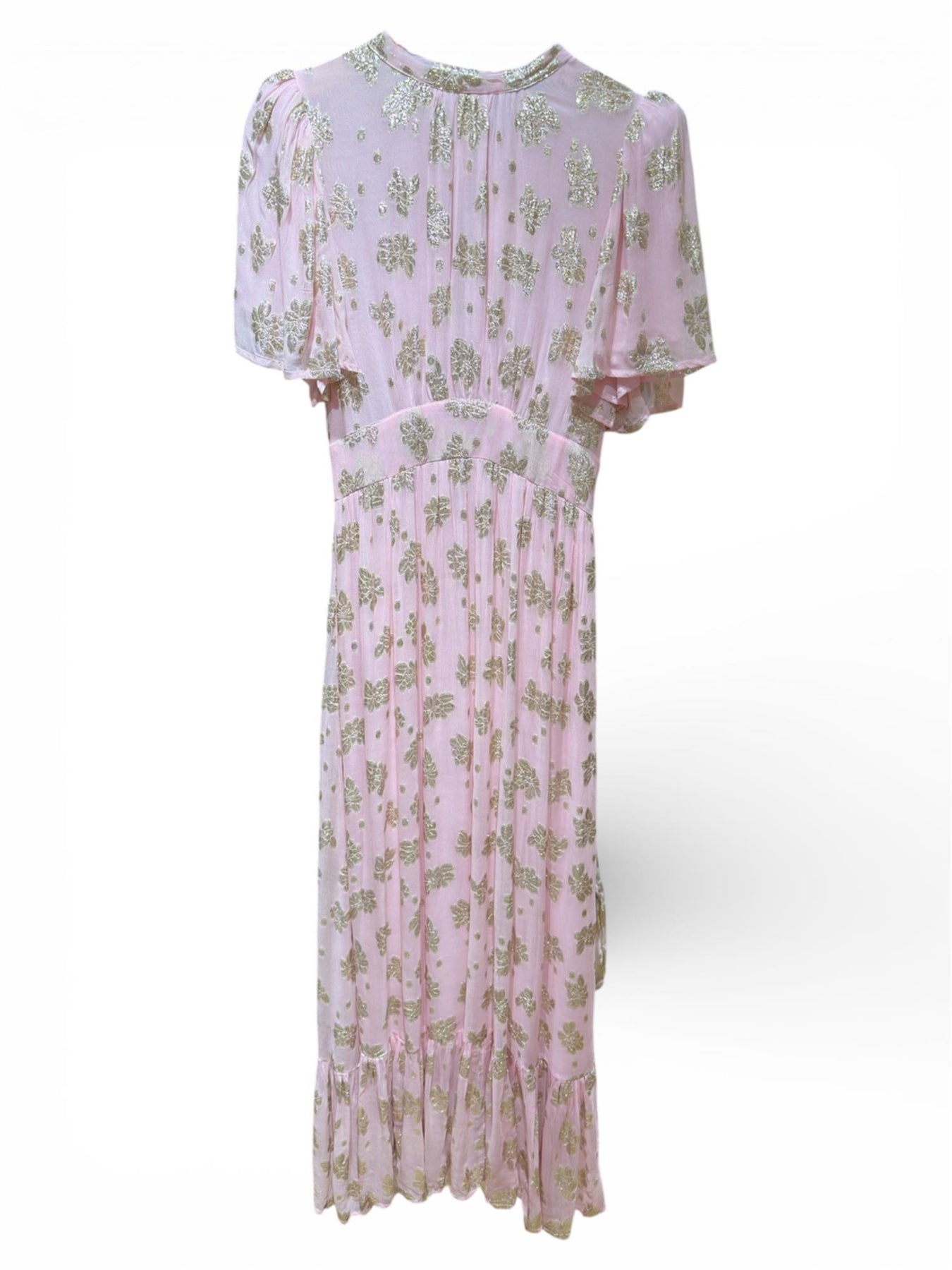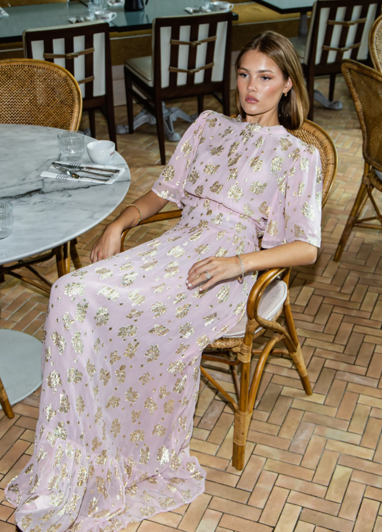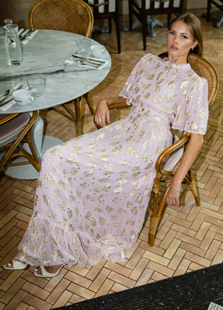 kjole til bryllupsgjest, lyserosa maxi kjole, MISSMAYA kjole, selskapskjole dame, romantisk sommerkjole, kjole med gullmønster, elegant festkjole