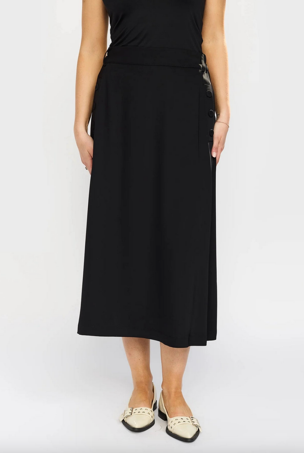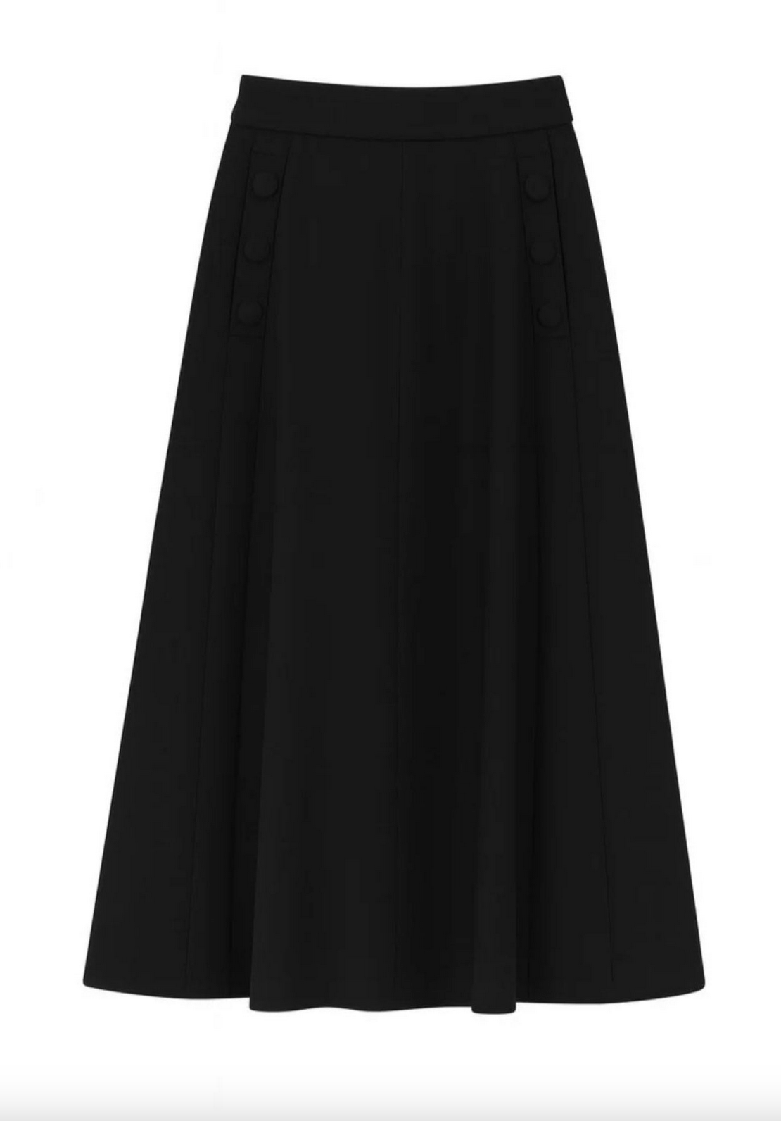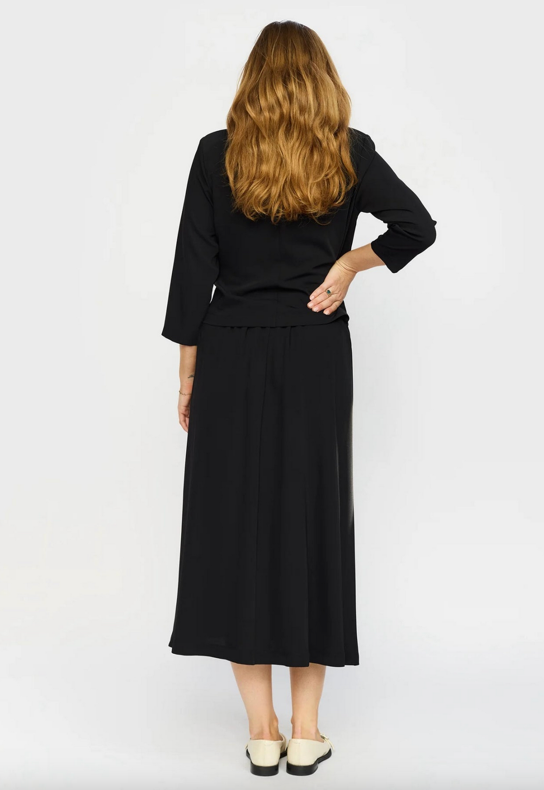 Oline er et klassisk sort skjørt med lommer i sidene og elastikk bak i linningen. Fin midi lengde og oppleves som normal i størrelsen.